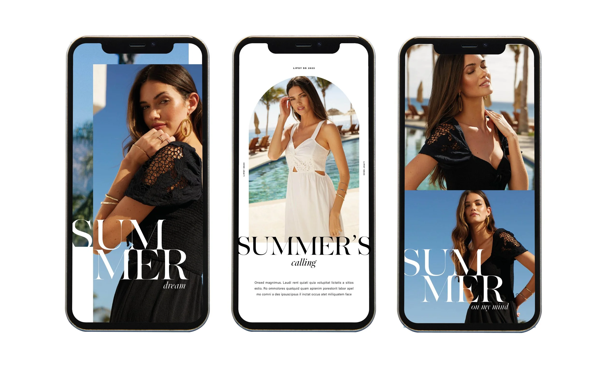 Multi-channel platform design for Lipsy London. Campaign designs, including multiple touch points, such as PR collateral, email and web design to social media channel designs.